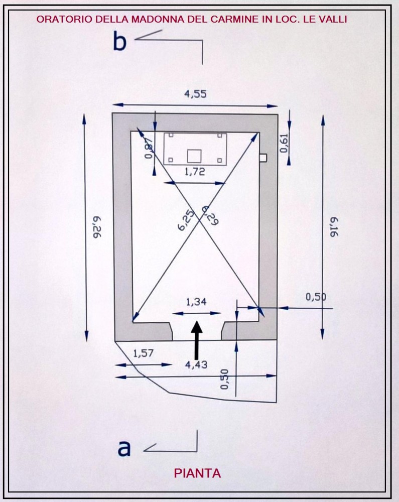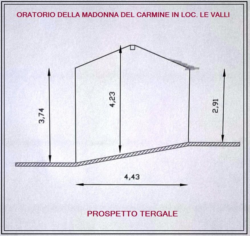 Rilievo grafico dell’oratorio posto in località Le Valli, anticamente dedicato alla Madonna del Carmine. Esecuzione Amministrazione comunale di San Godenzo.